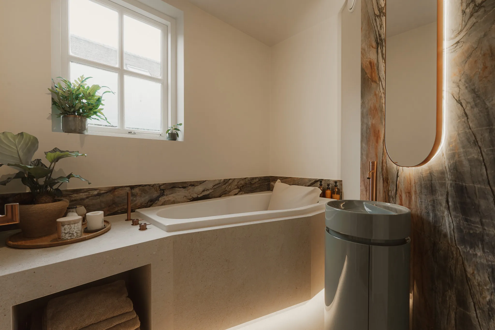 Een lichte en serene badkamer in Zegveld, waarin grootformaat tegelwerk en maatwerk natuursteen met indirecte verlichting samenkomen. Warm hout en geborsteld koperdetails geven het geheel een verfijnde, hotelachtige uitstraling.