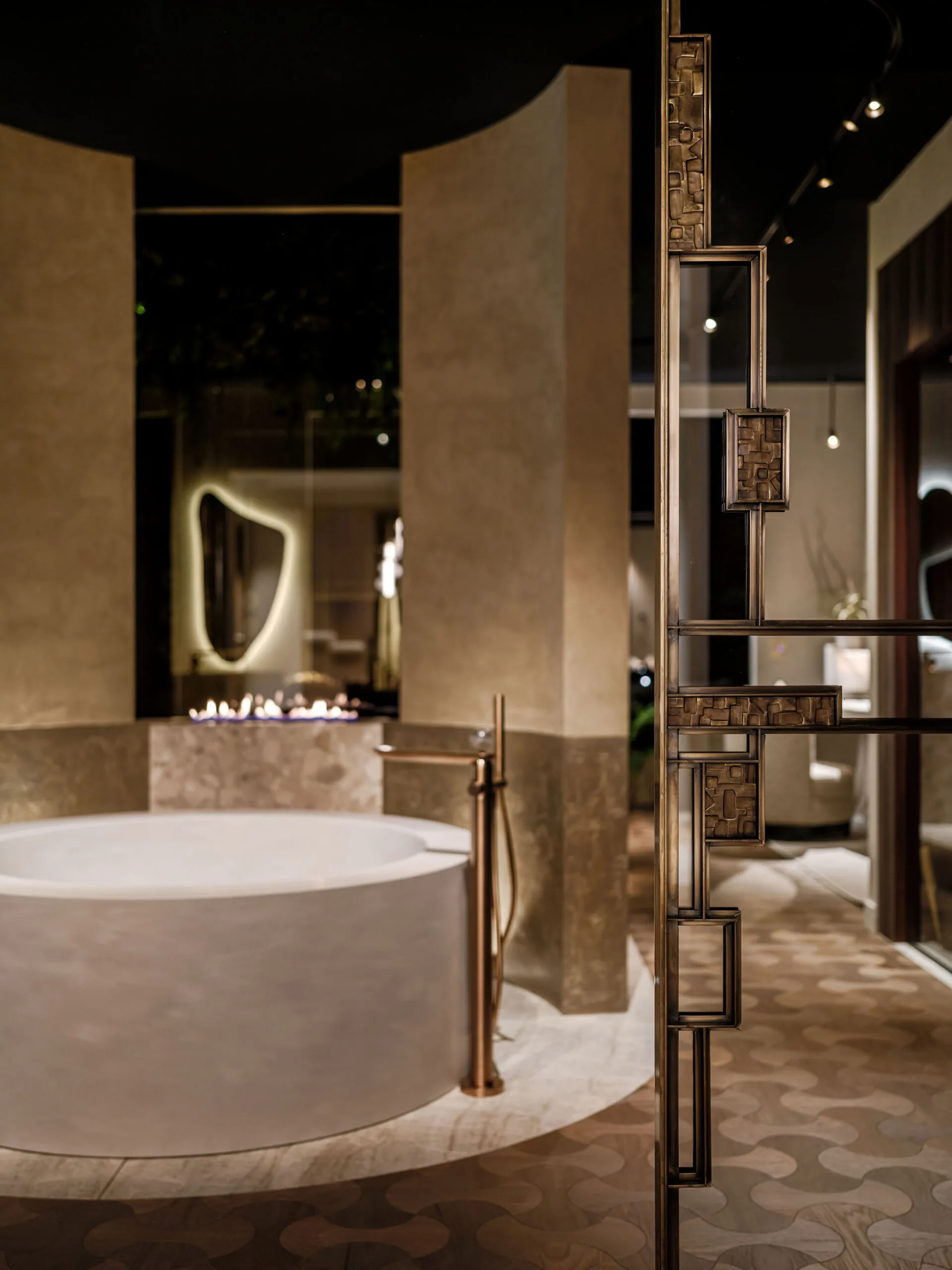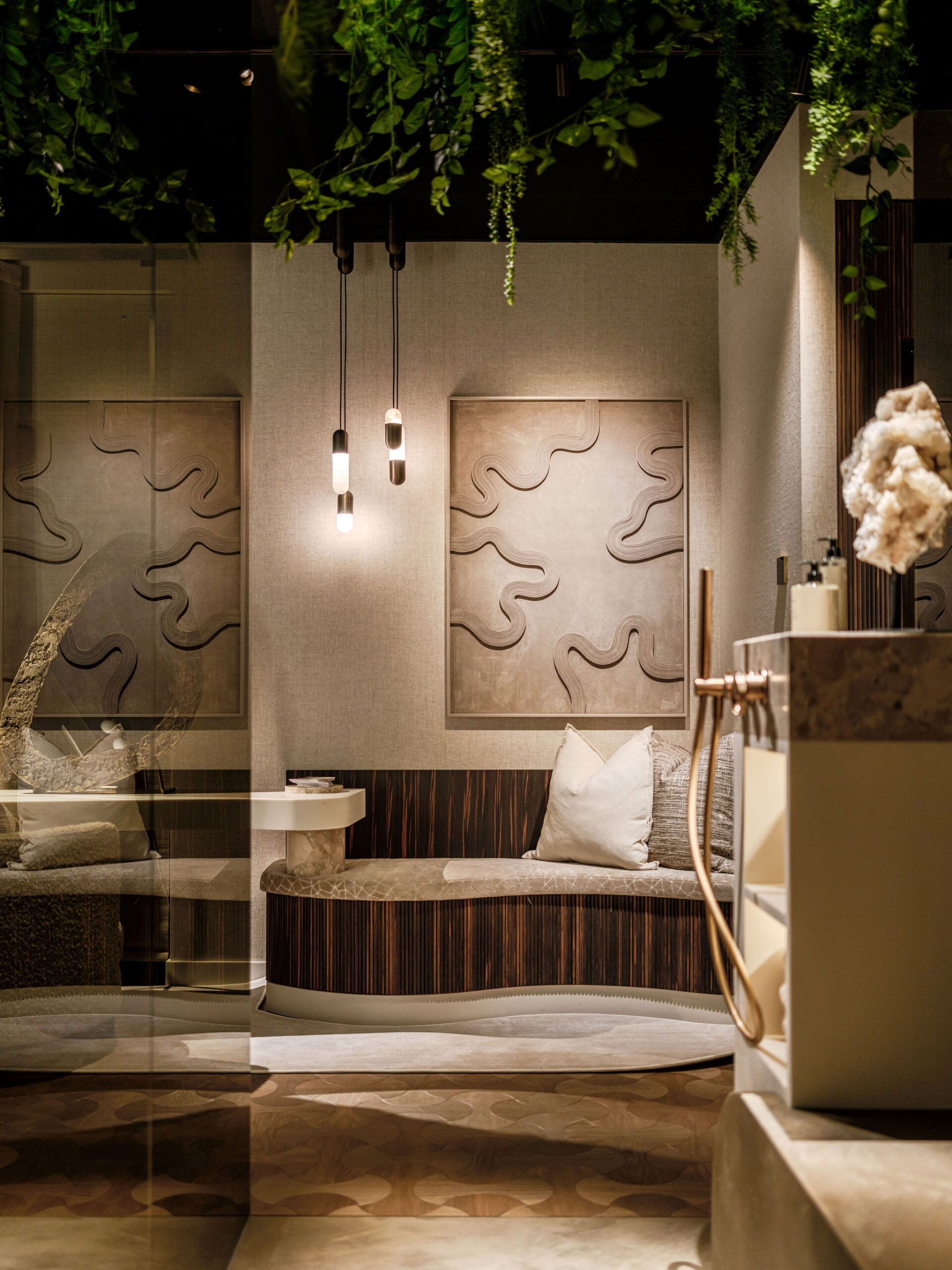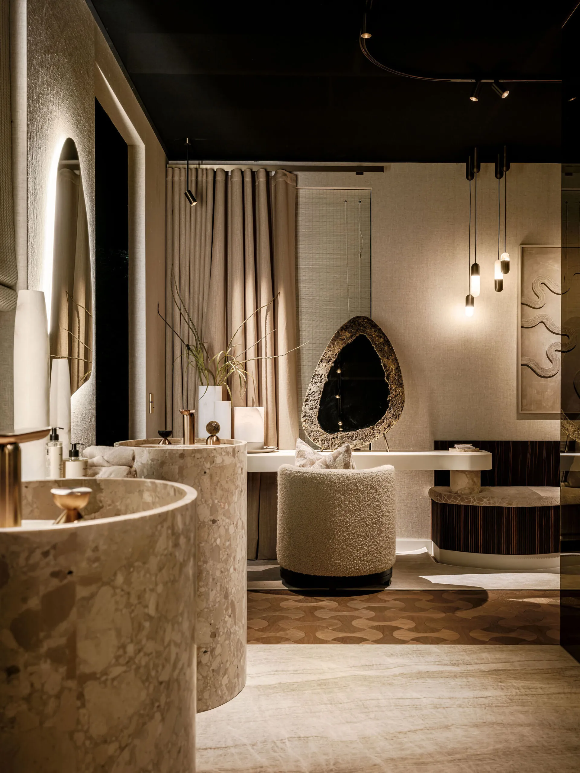 Er wordt veel gewerkt met rijke, natuurlijke materialen zoals natuursteen, hout en metaal, aangevuld met luxe stoffen en verfijnde texturen. Het kleurenpalet is krachtig en warm tegelijk: diepe aardetinten en neutrale basiskleuren zorgen voor een sterke, maar harmonieuze uitstraling.