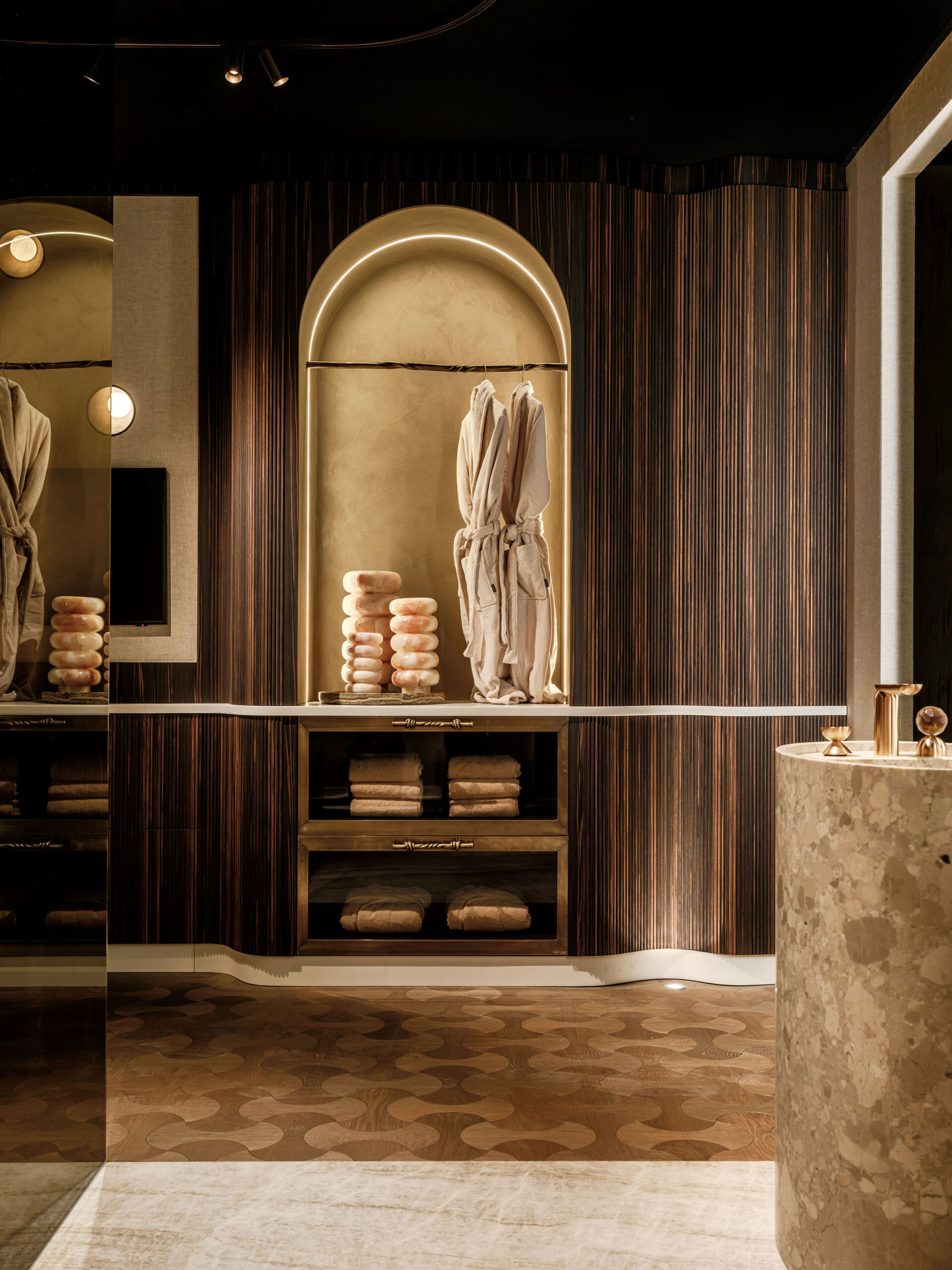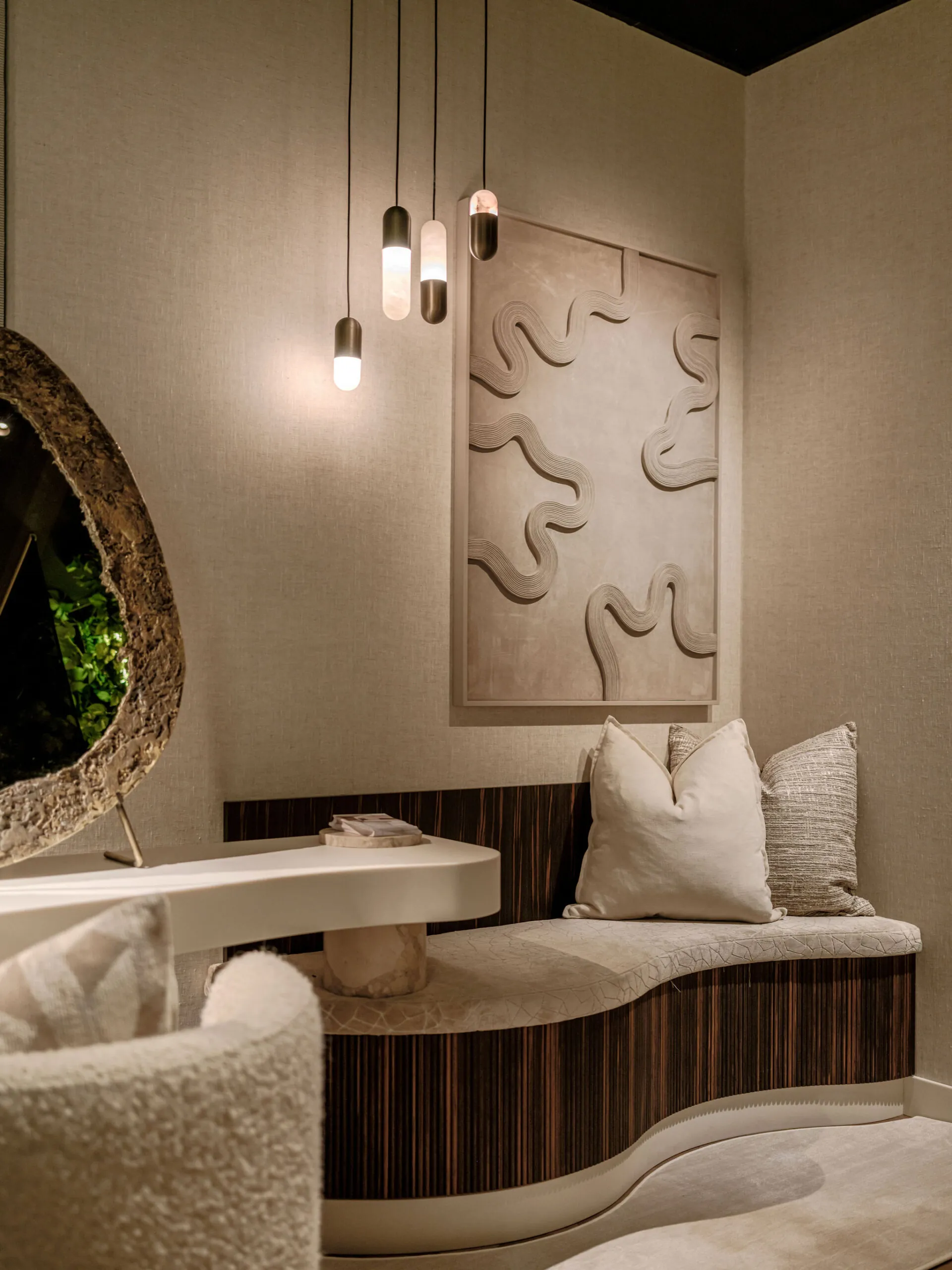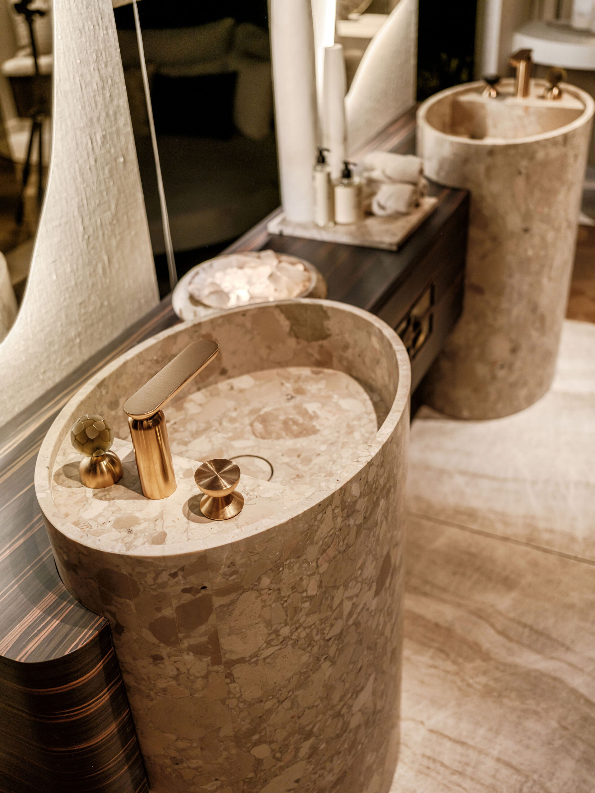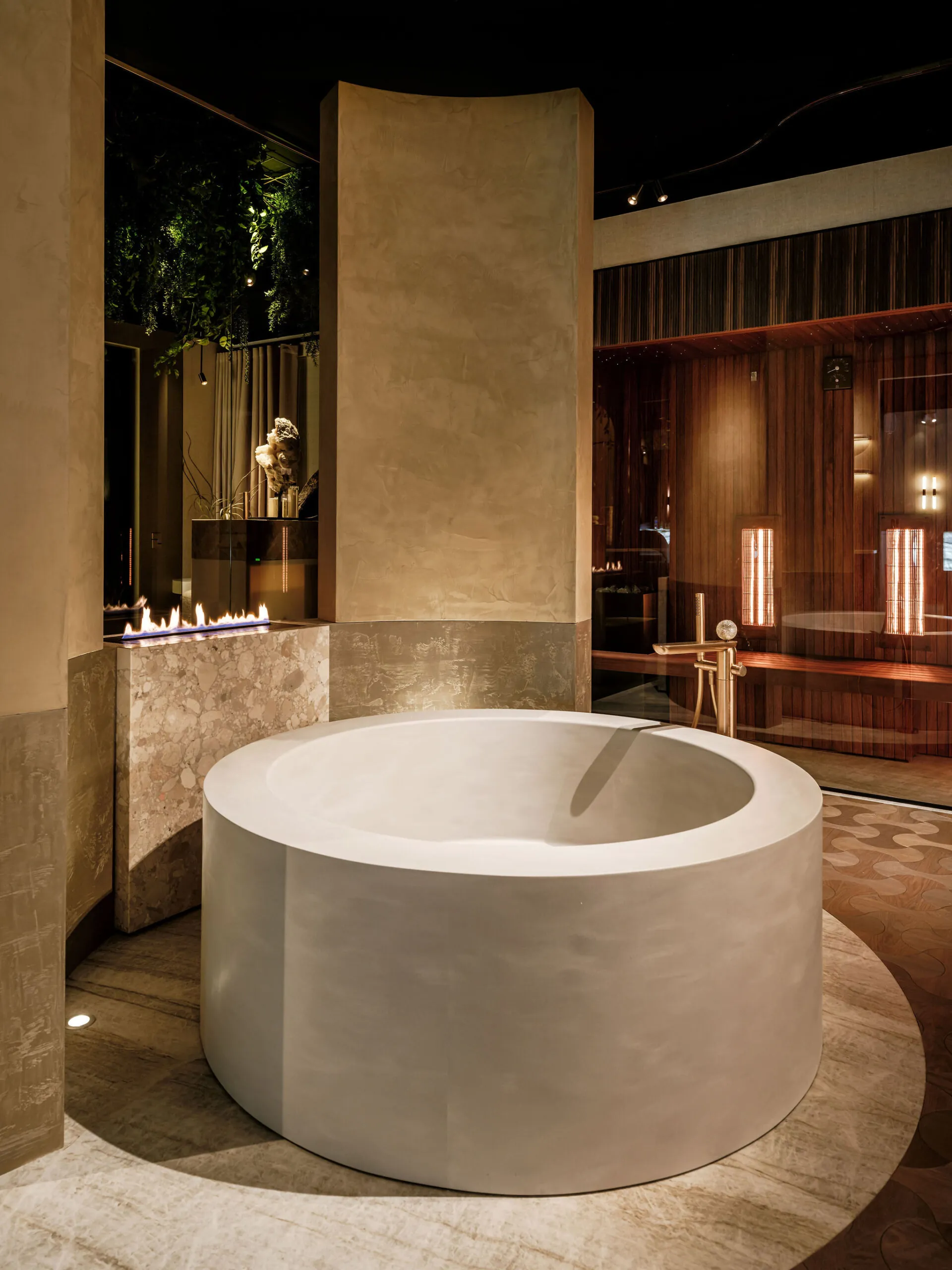 Er wordt veel gewerkt met rijke, natuurlijke materialen zoals natuursteen, hout en metaal, aangevuld met luxe stoffen en verfijnde texturen. Het kleurenpalet is krachtig en warm tegelijk: diepe aardetinten en neutrale basiskleuren zorgen voor een sterke, maar harmonieuze uitstraling.
