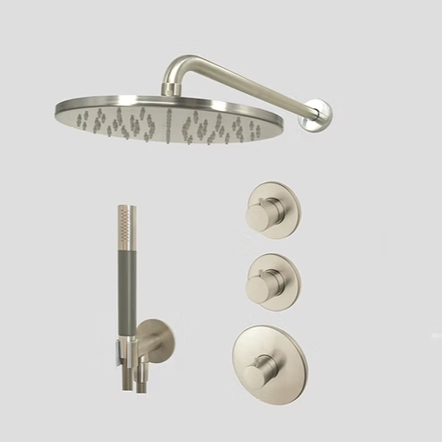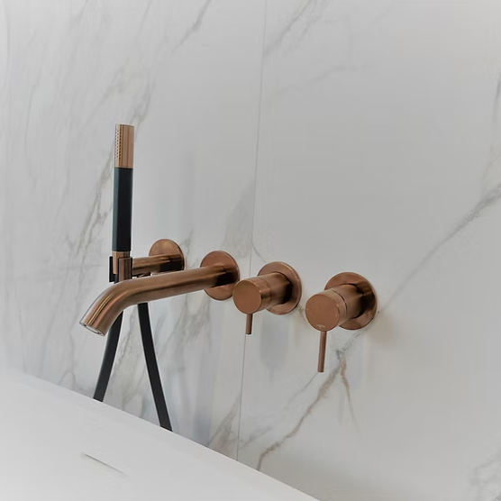 In industriële badkamers worden vaak donkere afwerkingen zoals matzwart of gunmetal gebruikt, bijvoorbeeld in combinatie met betonlook tegels of staalaccenten. In badkamers met warmere materialen zoals hout en natuursteen worden vaker geborstelde of messingkleurige afwerkingen toegepast.