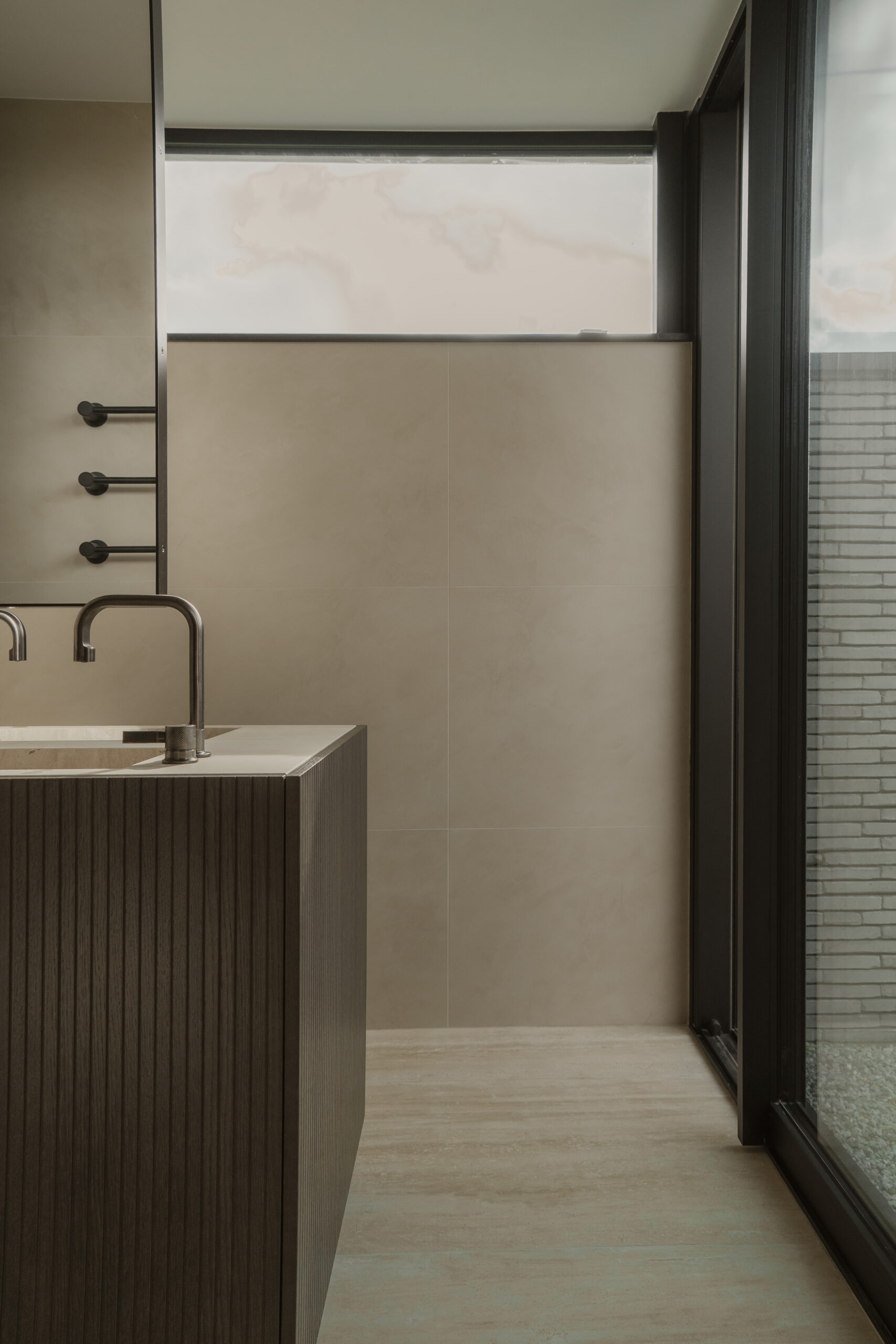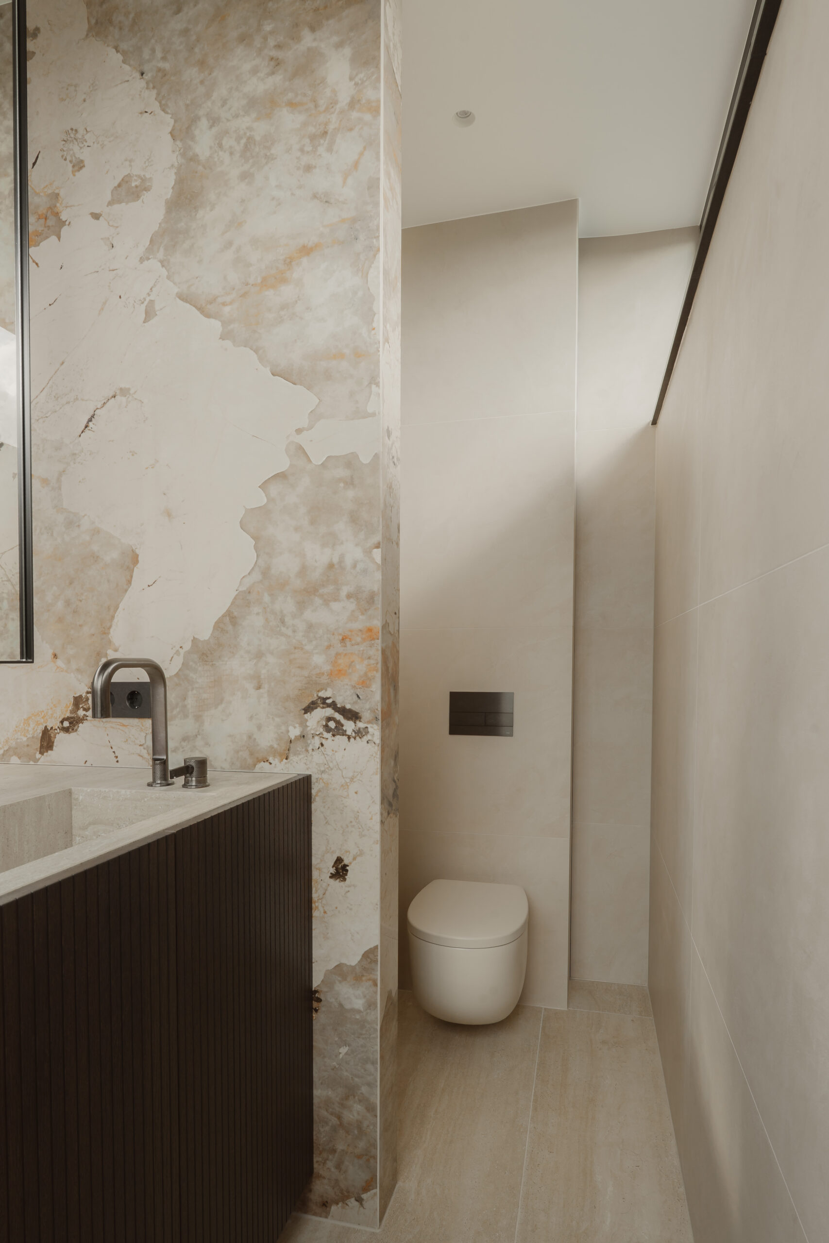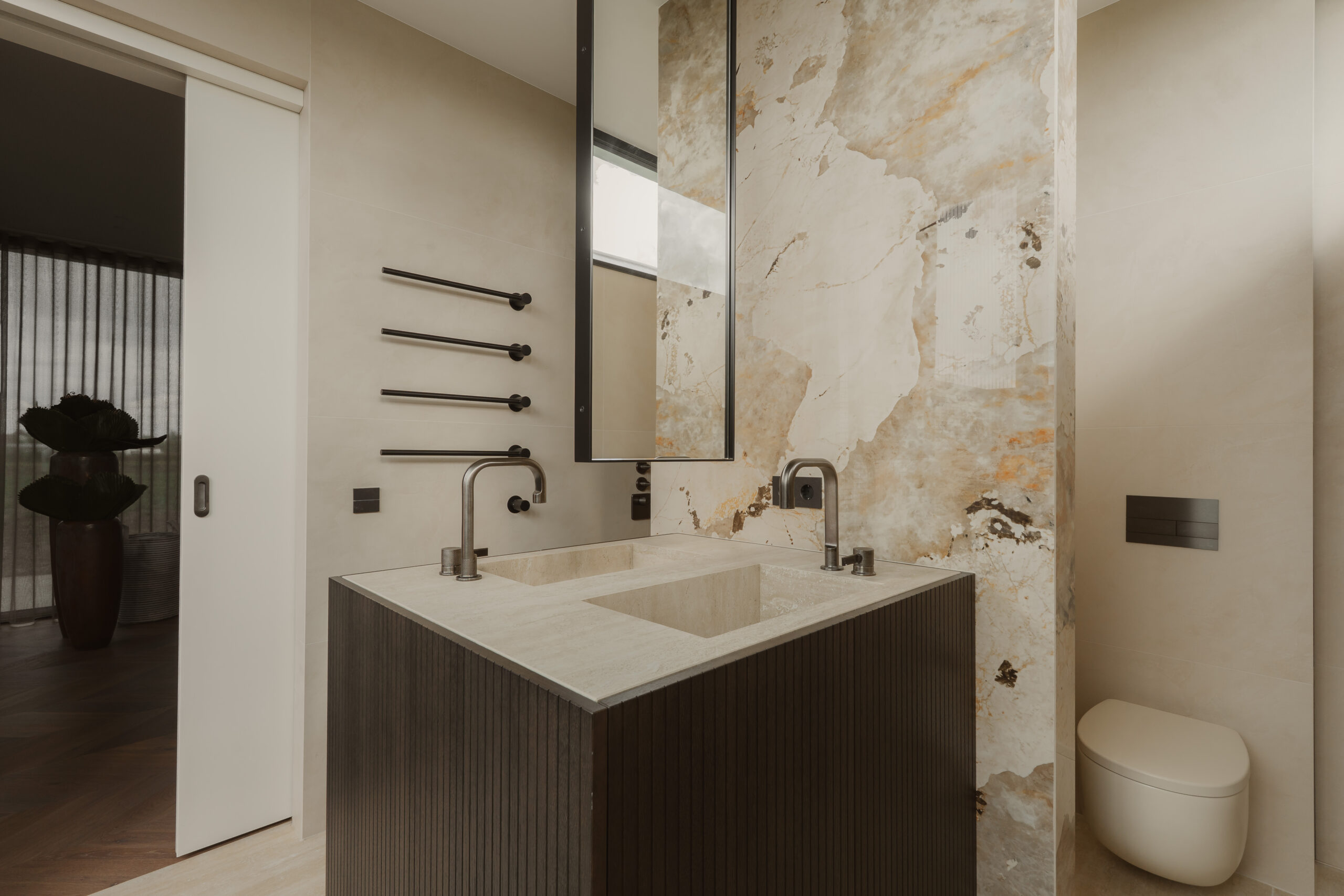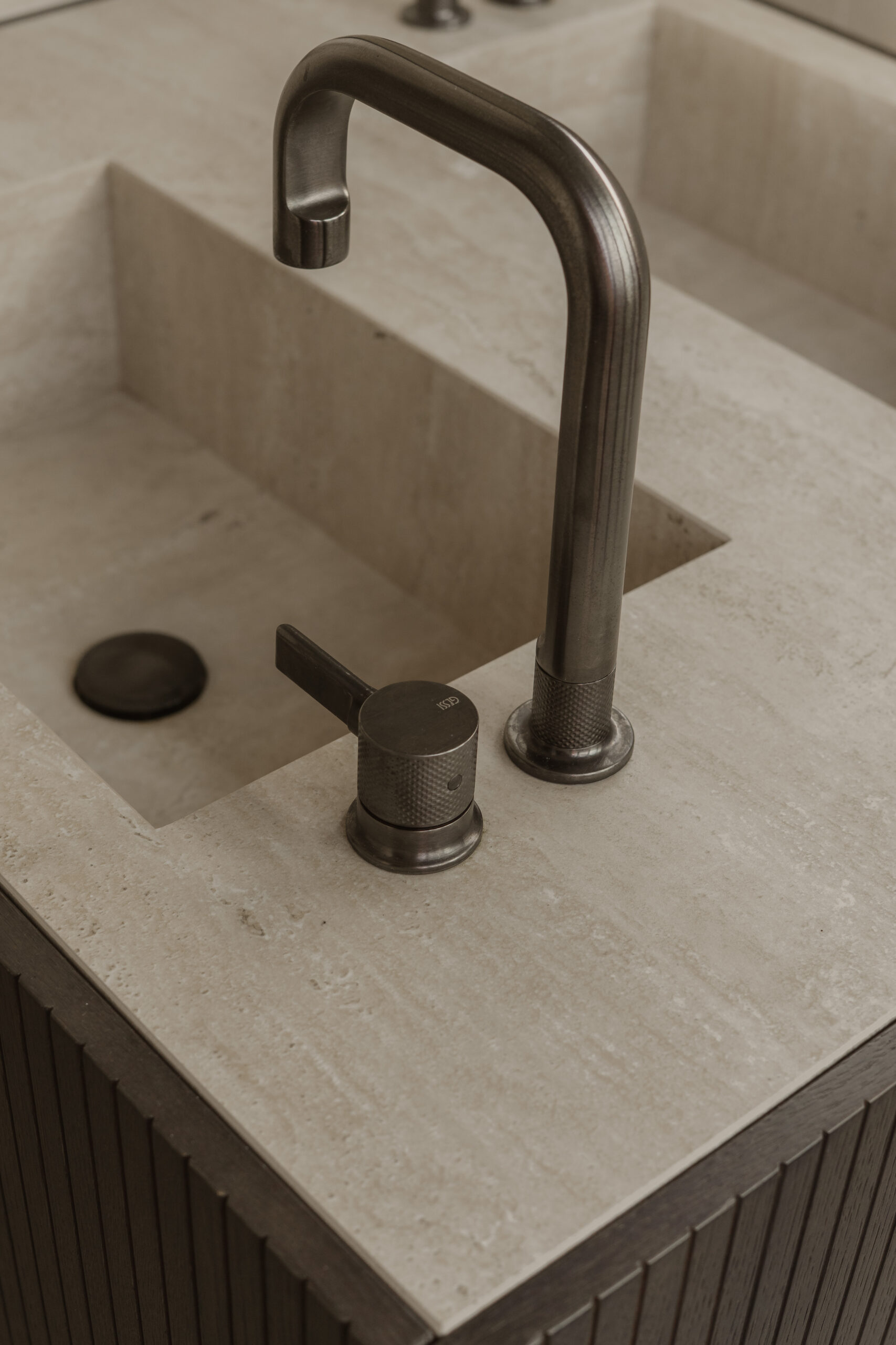 Het maatwerkmeubel vormt een ware eyecatcher. Uitgevoerd in donker eiken en voorzien van een blad in Touch Stone Gold Vein, met dubbele wastafel. De twee GESSI Inciso wastafelkranen in geborsteld zwart metaal geven het geheel een stoere, maar verfijnde uitstraling. Boven de wastafels hangt de REXA Swing Mirror, die met zijn strakke lijnenspel zorgt voor extra diepte en symmetrie. Het meubel voelt aan als een ‘wastafeleiland’ – solide, elegant en centraal in de ruimte geplaatst.