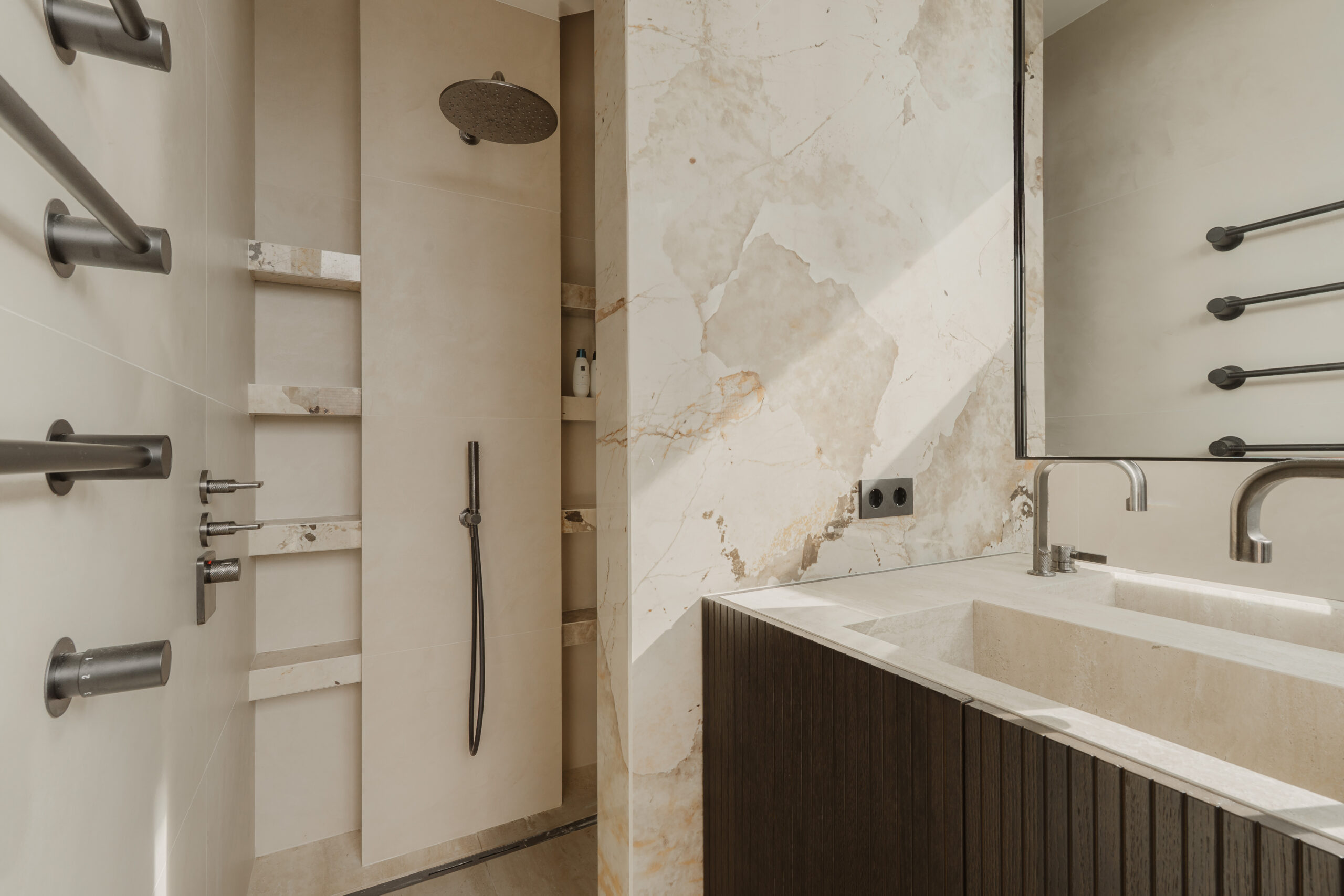 Het douchegedeelte sluit naadloos aan op de rest van de badkamer. De wanden en plankjes zijn strak uitgevoerd en bieden zowel functionaliteit als esthetiek. Ook hier is de stoere GESSI Inciso-serie doorgetrokken, wat zorgt voor continuïteit in vorm en afwerking. De combinatie van donker metaal en zachte steenstructuren geeft de douche een elegante, moderne uitstraling.