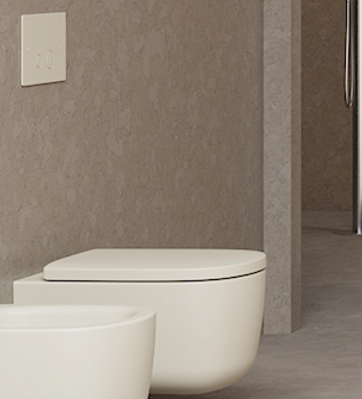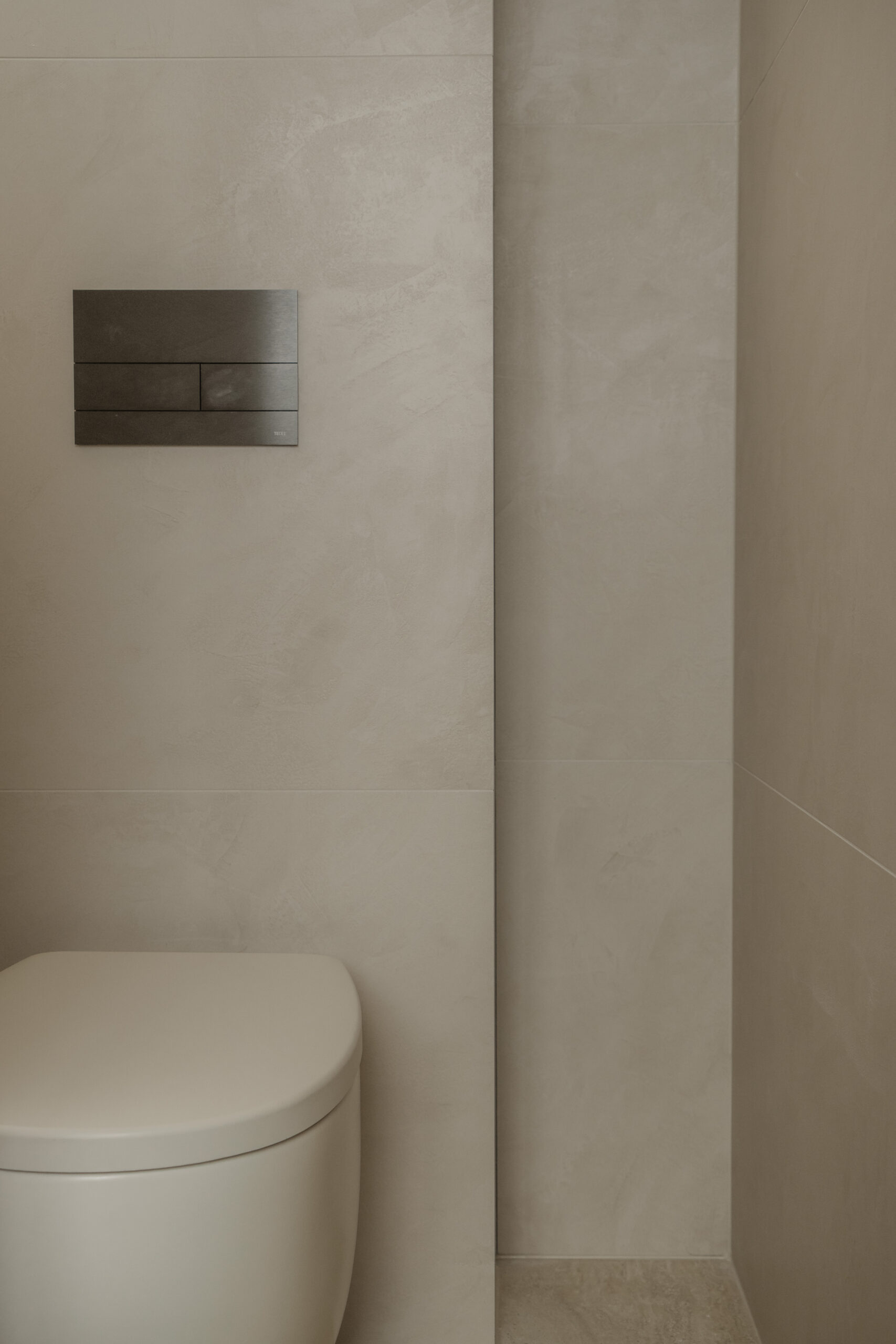 De toiletruimte is in dezelfde serene sfeer uitgevoerd. Hier is gekozen voor het NIC Design wandcloset, gecombineerd met een TECE Square II bedieningsplaat in zwart chroom. De accessoires uit de GESSI Inciso-lijn zijn doorgevoerd in dezelfde afwerking, waardoor ook deze ruimte een harmonieus geheel vormt.