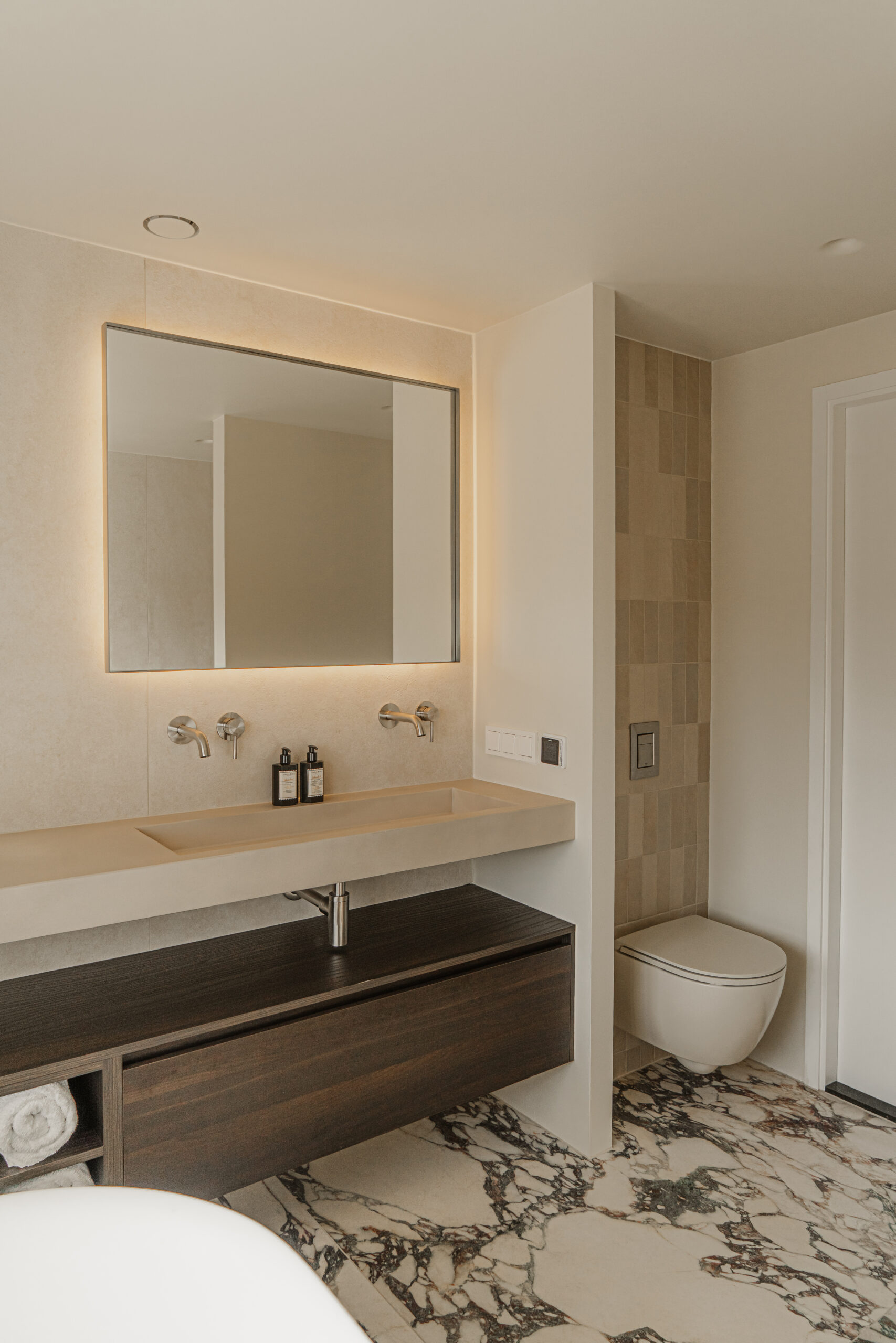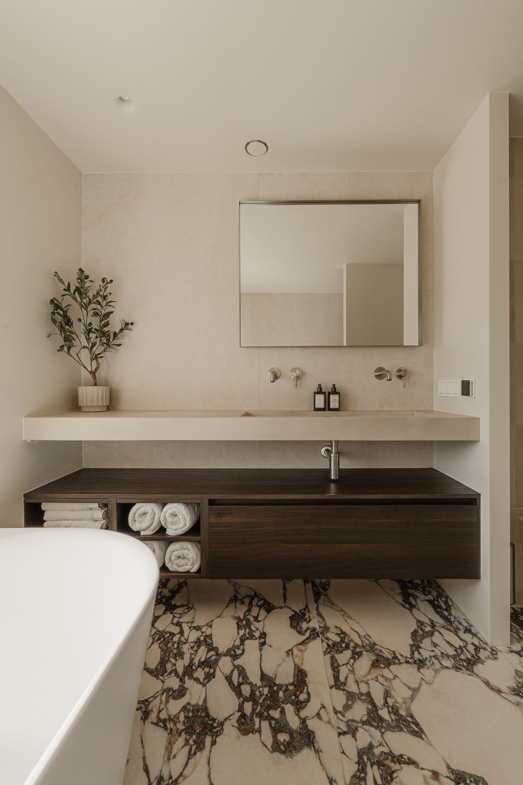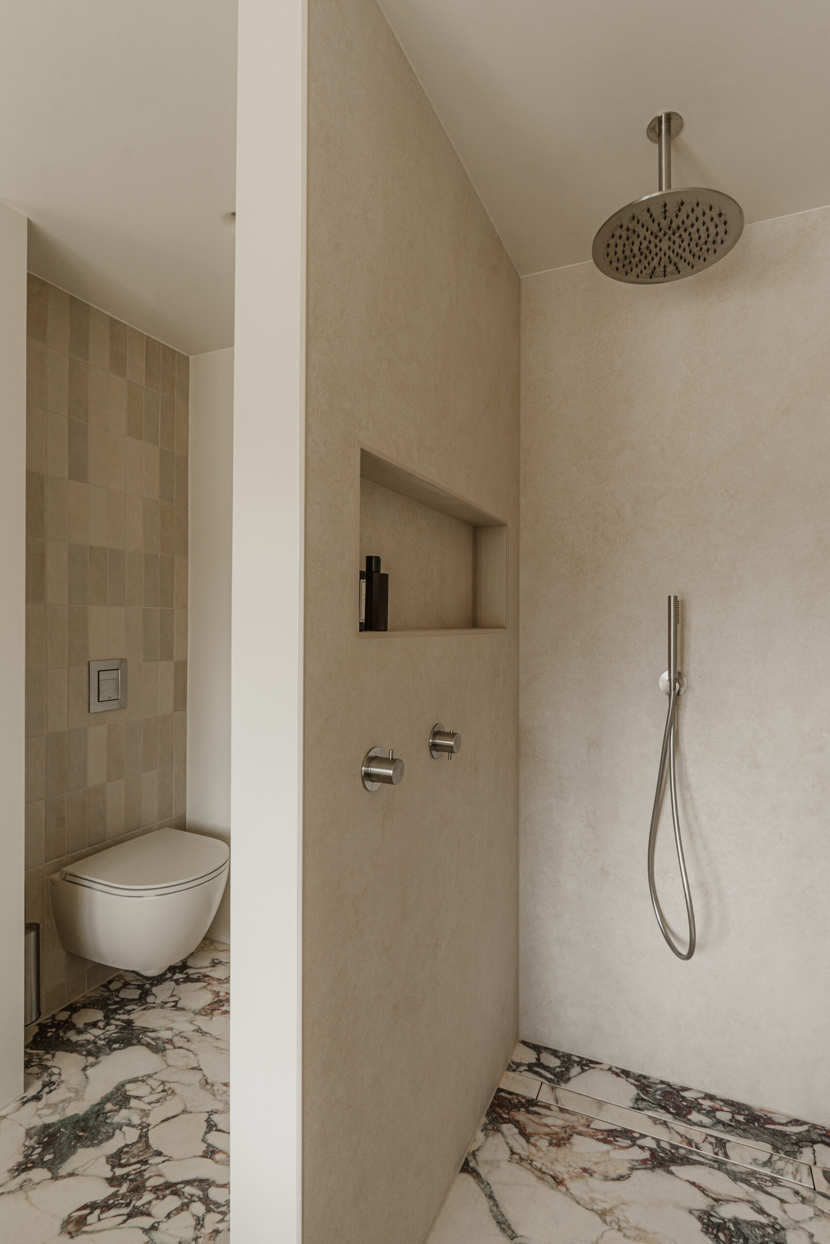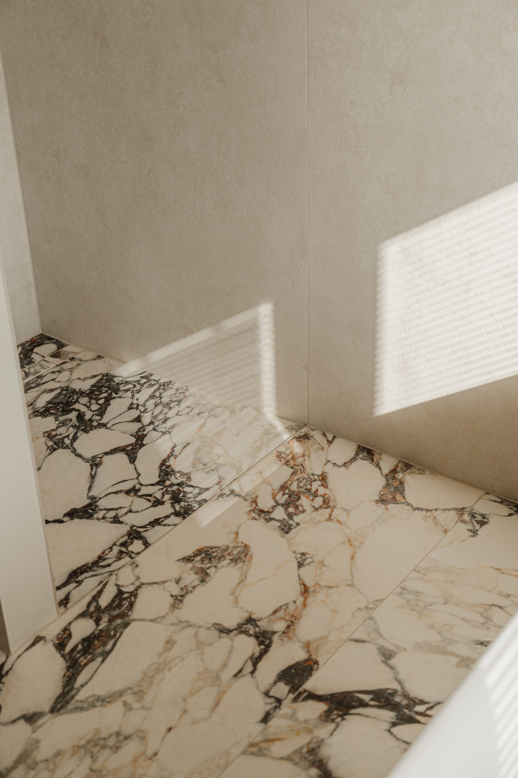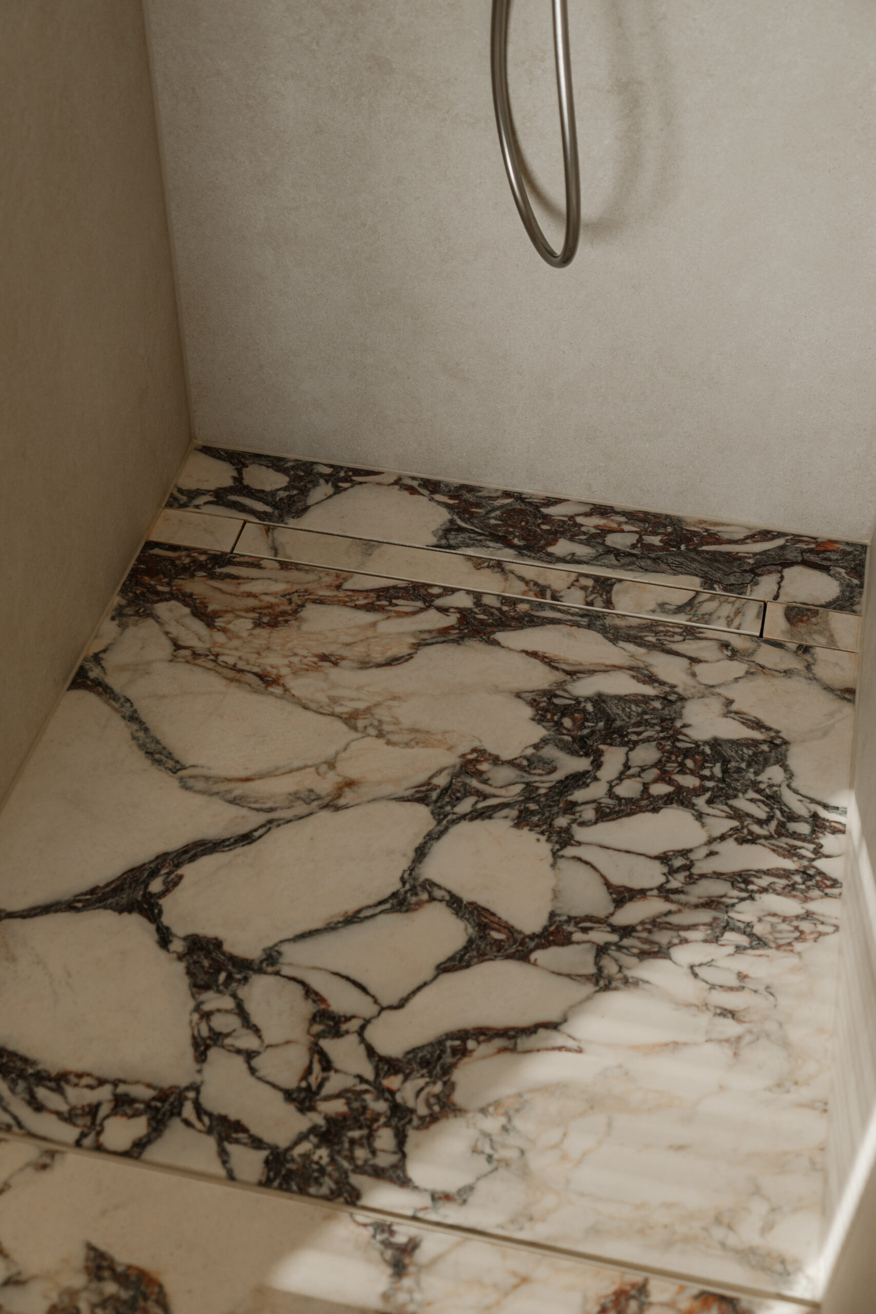 De vloer is doorgelegd met Calacatta Viola tegels, gecombineerd met een TECE drainline douchegoot voor een strakke afwatering.