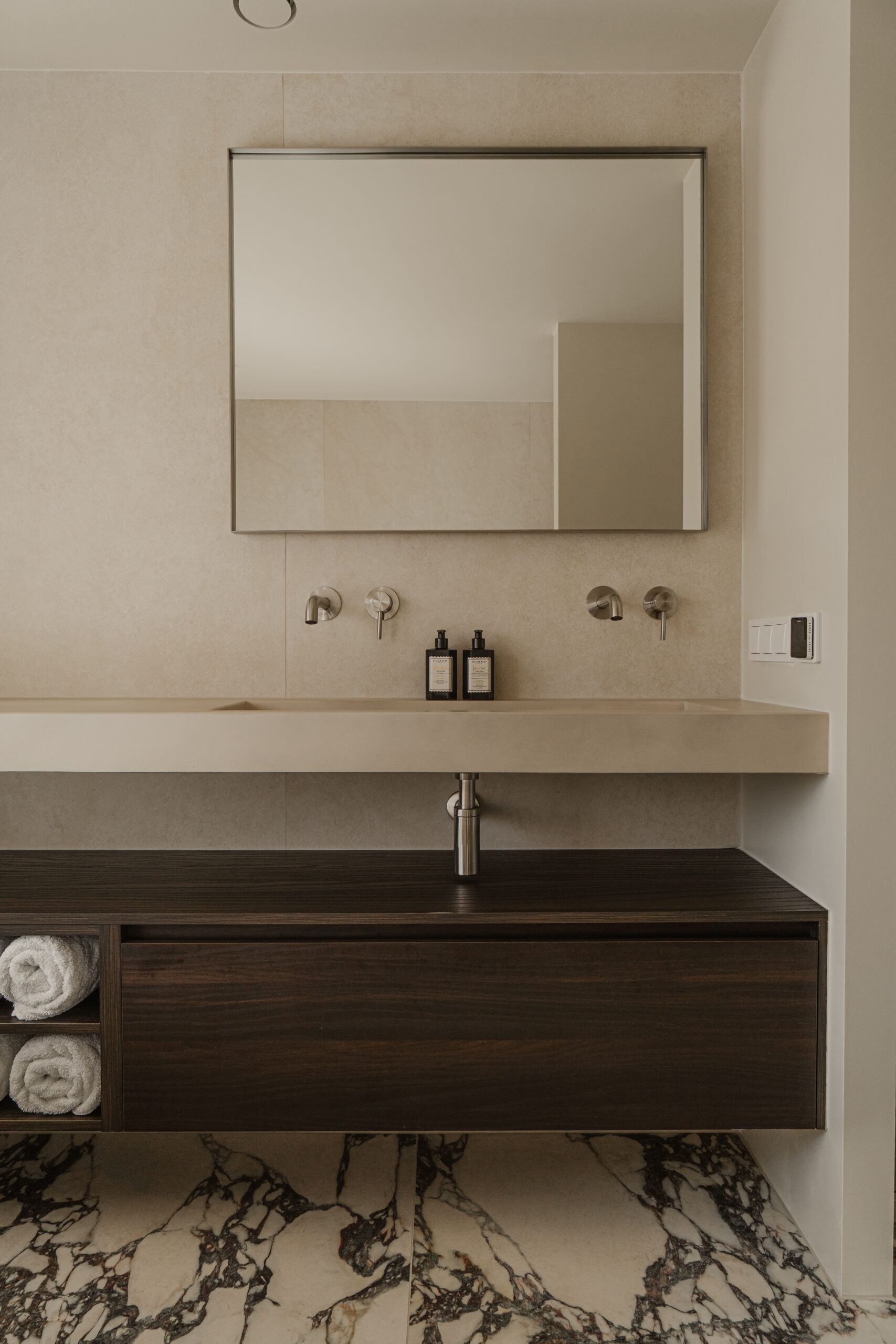 De vloer is uitgevoerd in Calacatta Viola, wat zorgt voor een sterk visueel contrast binnen het verder ingetogen ontwerp.