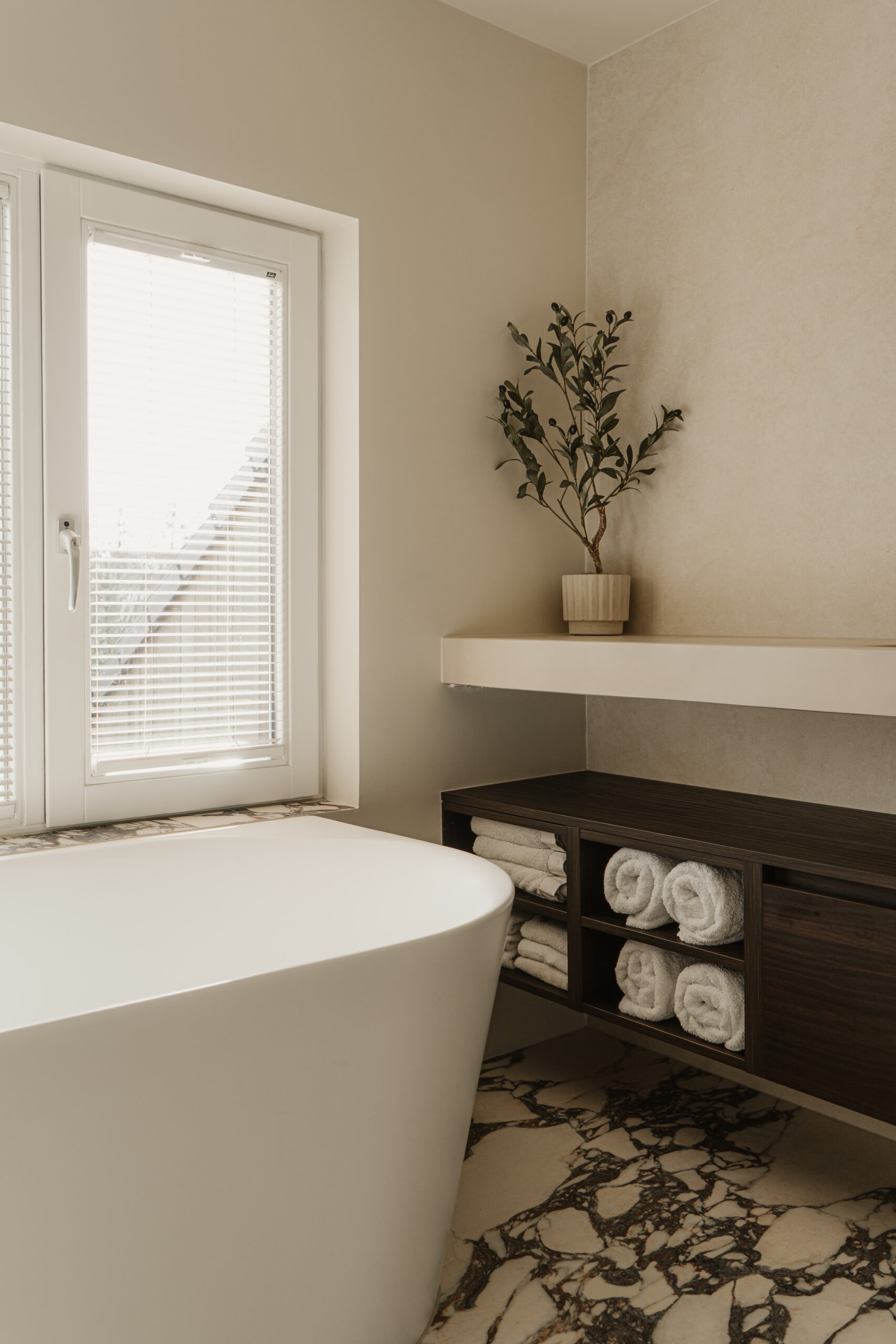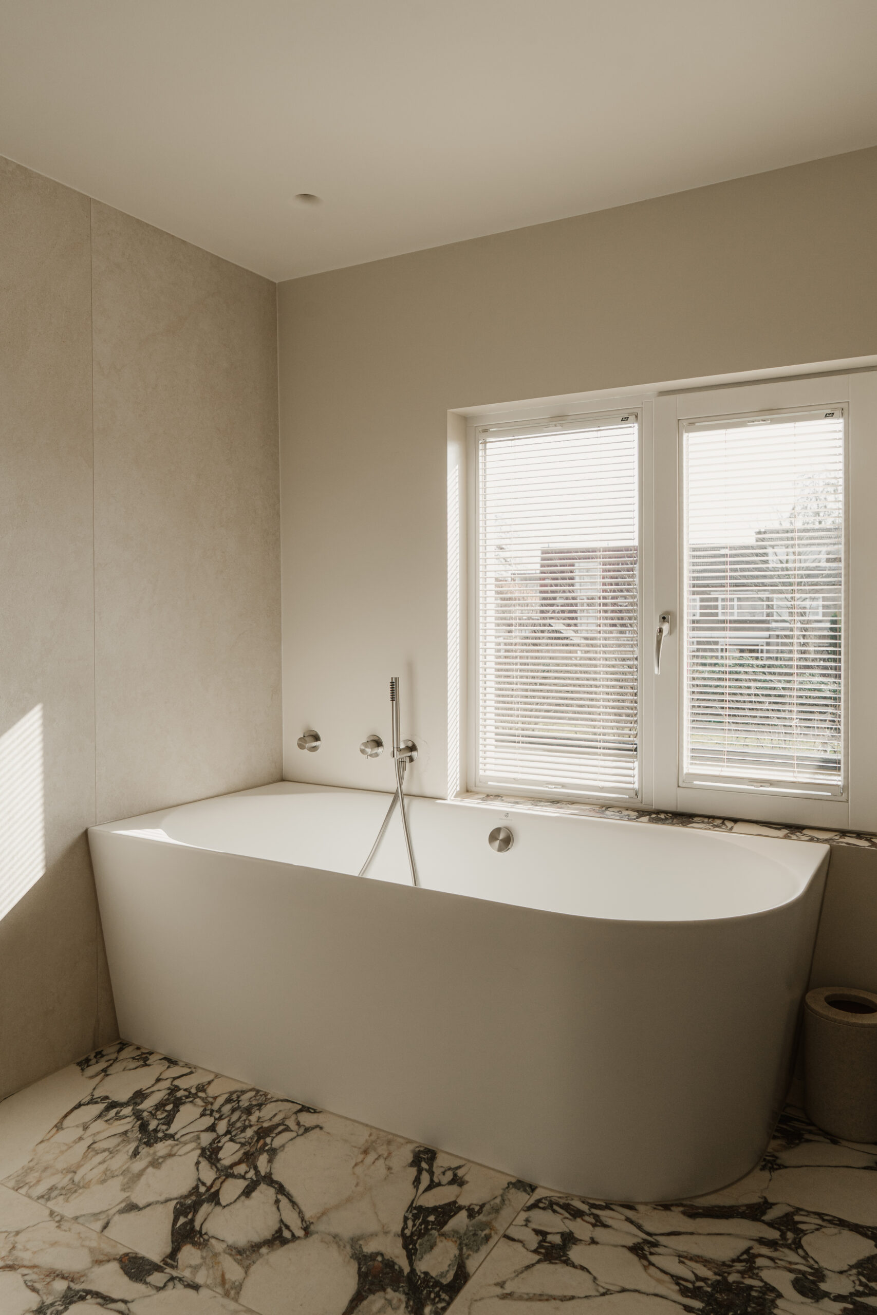 De vloer is uitgevoerd in Ariostea Ultra Marmi Calacatta Viola, met een uitgesproken marmertekening die contrasteert met de lichte wanden.