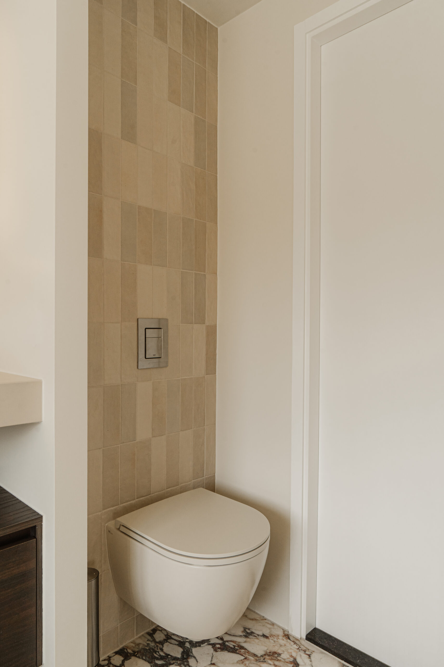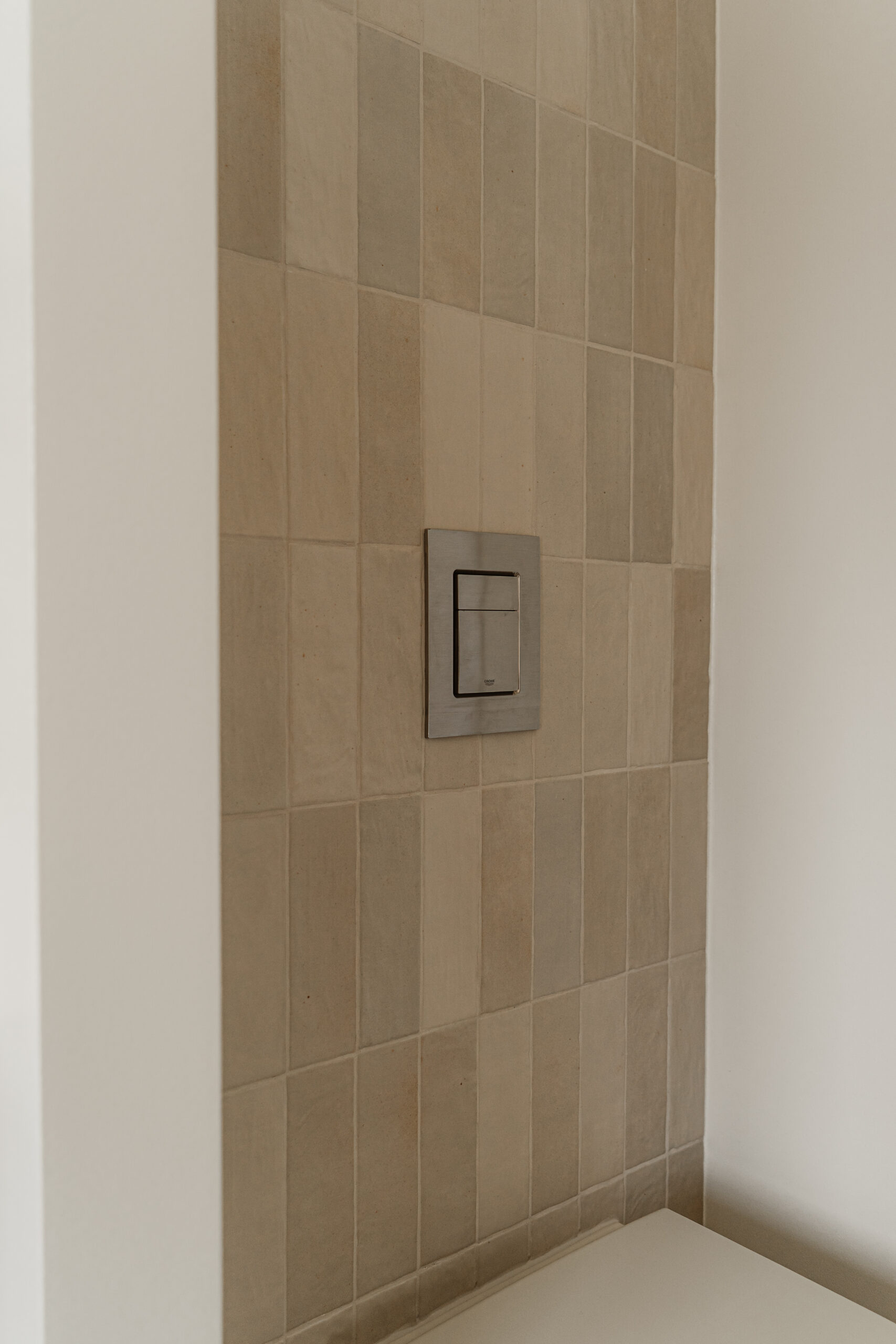 In het toilet is gekozen voor handvorm tegels van Harmony (6,5 x 20 cm, kleur Sand). Deze tegels zorgen voor een subtiel reliëf en een zachtere uitstraling binnen de nis.