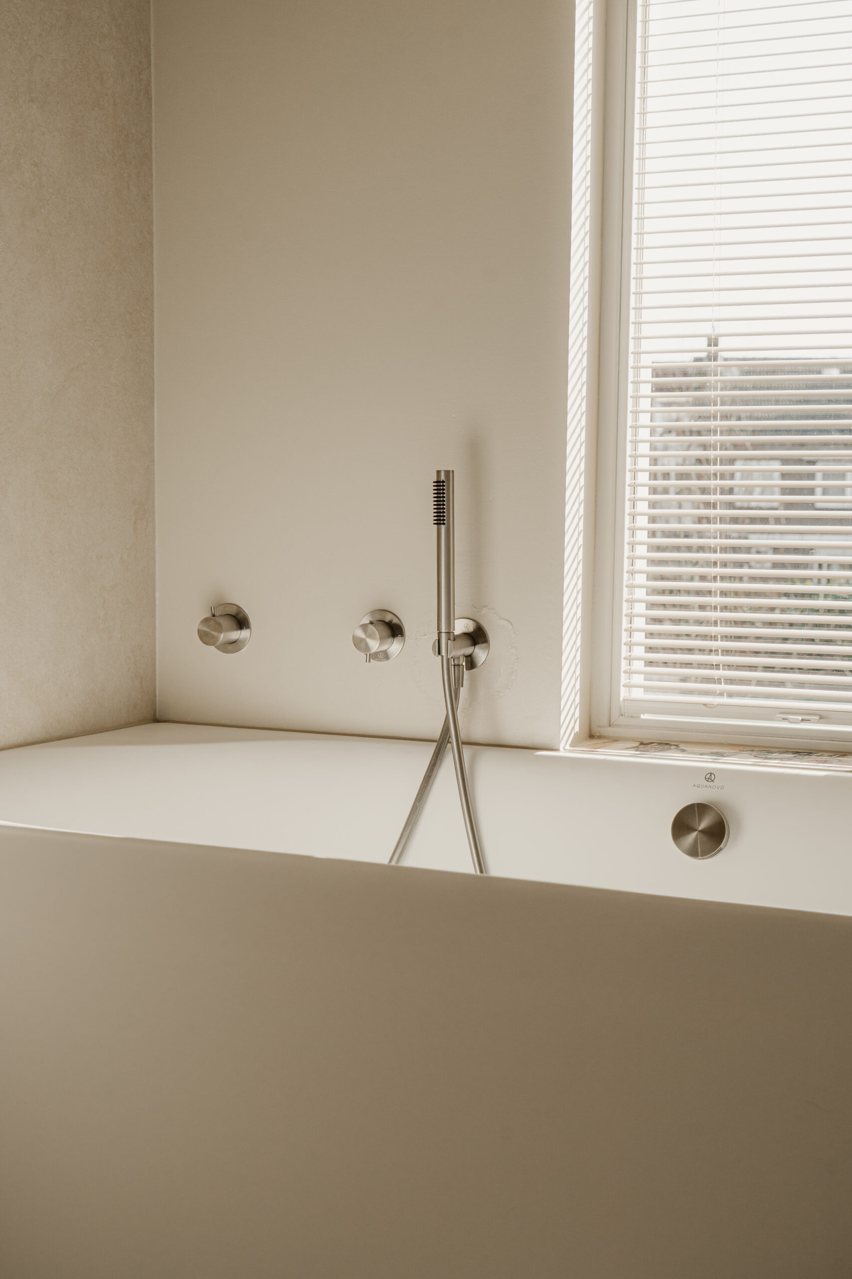 De badzone is gesitueerd bij het raam en uitgevoerd met een AQNO Firenze ligbad in mat wit. Het bad is geplaatst in een hoekopstelling en heeft een strakke, vrijstaande uitstraling.