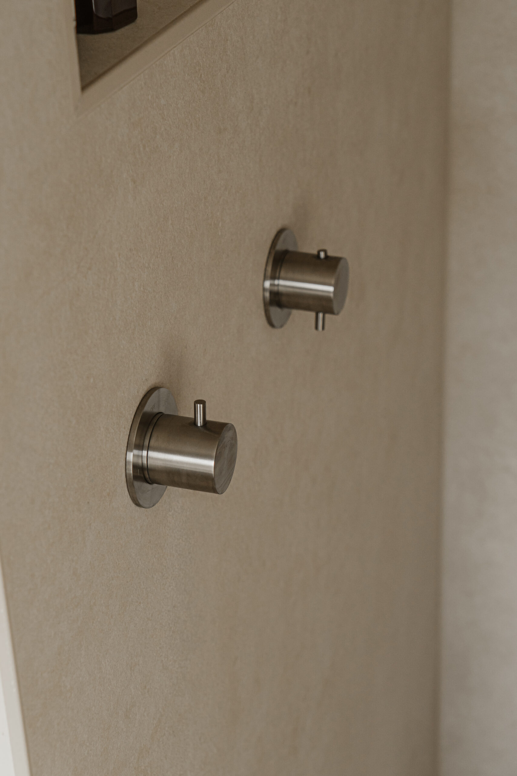 De wanden in de badkamer zijn uitgevoerd in grootformaat Ariostea Ultra Pietre tegels (300 x 100 cm) in de kleur Jerusalem limestone strutturato. Door het grote formaat ontstaat een rustig wandbeeld met minimale voegwerking.