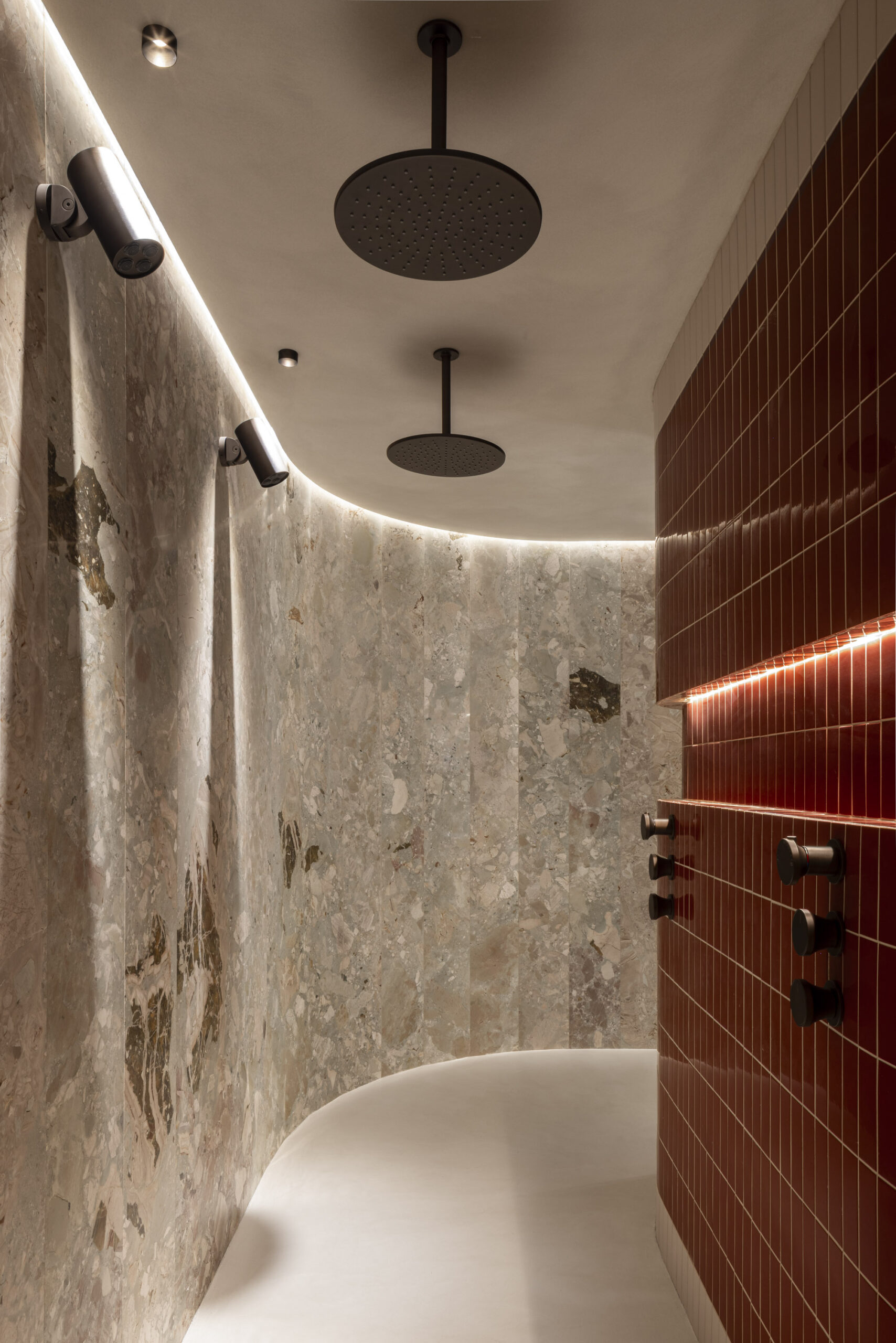 De royale inloopdouche is uitgevoerd met gebogen wanden in Breccia Botticelli-natuursteen en een opvallende accentwand in glanzend rode tegels. De combinatie van textuur en kleur zorgt voor spanning en karakter. De douche is voorzien van een Gessi Inciso Shower plafonddouche, Gessi Flessa Spotwater316 douchekop en een Gessi Origini thermostatische mengkraan met stopkraan. Samen creëren deze elementen een luxe en volledig op maat gemaakte wellnessbeleving.