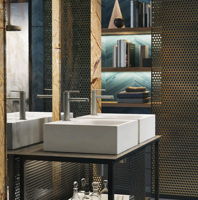 Natuurlijke materialen zijn een belangrijk onderdeel. Veelvoorkomend zijn wastafelmeubels van hout, waarbij smalle verticale latjes zorgen voor een speels effect. Ook stenen waskommen worden vaak gebruikt in een Japandi badkamer.