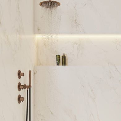 Een bepalende keuze voor de uitstraling van een luxe badkamer zijn de badkamertegels. Omdat ze vaak zowel de vloer als muren bedekken zijn tegels sfeerbepalend. Kies daarom een tegel die nét die extra luxe uitstraling geeft. Ga voor hoogwaardige materialen, unieke structuren en verfijnde afwerking. Een vaak gekozen tegel die een chique uitstraling heeft is een marmer(look) tegel. Ook natuursteentegels, zoals leisteen, zijn populair. In onze showroom kunt u veel verschillende tegels bekijken.